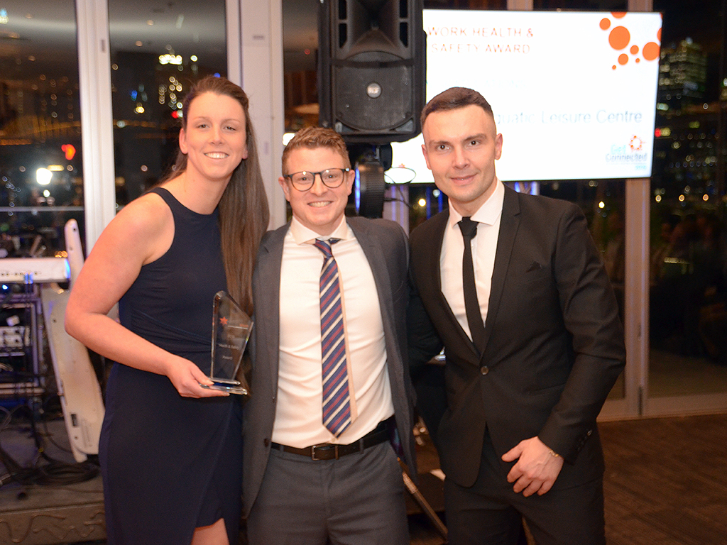 Aquarena Centre Manager Aylie Spence and Operations Manager Bobby Savic (right) accept the Workplace Health and Safety Award from Alex Lord.