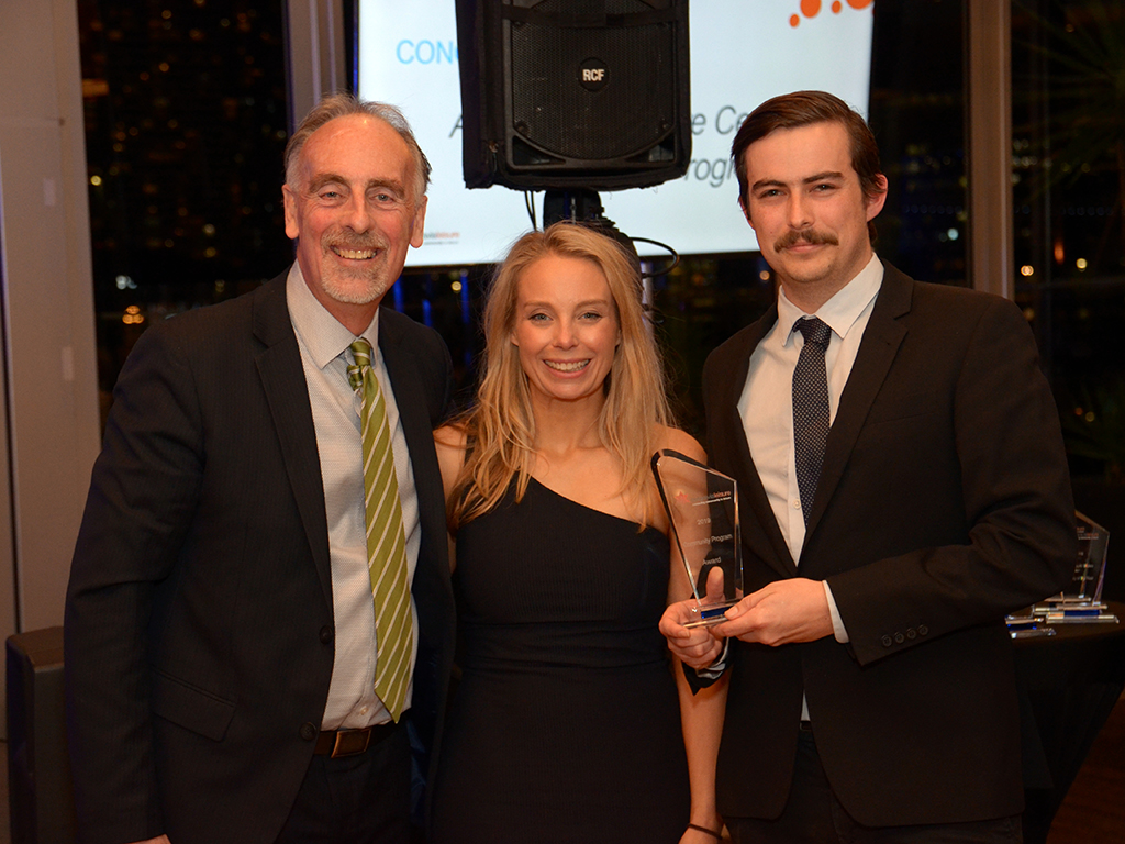 Alex Simmons (left), Belgravia Leisure GM of Operations, Anthony McIntosh and Rosie Keogh and the NSW Facility of the Year Award which was won by Annette Kellerman Aquatic Centre.