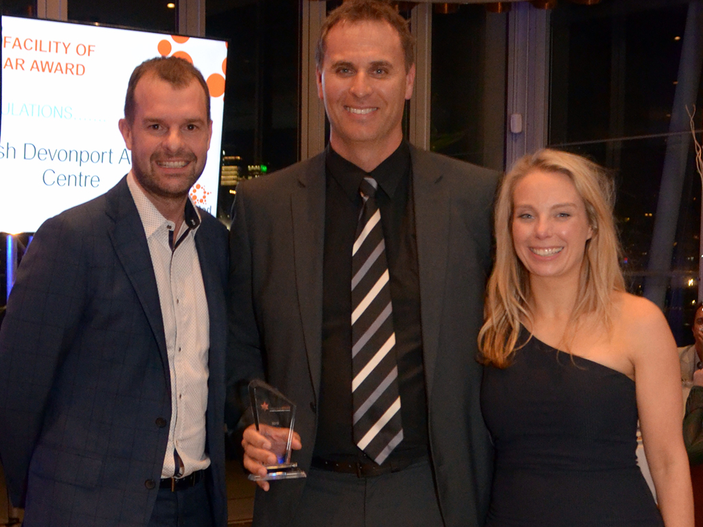 Splash Devonport Aquatic & Leisure Centre won the Vic/Tas Facility of the Year award. From left is Vic/Tas State Manager Kris Miller, Splash Centre Manager Andrew Towns, and Victorian Regional Area Manager Kara Monaghan.